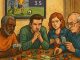 debating sports predictions with playful stubbornness. Relatives gathering for a small card game on a